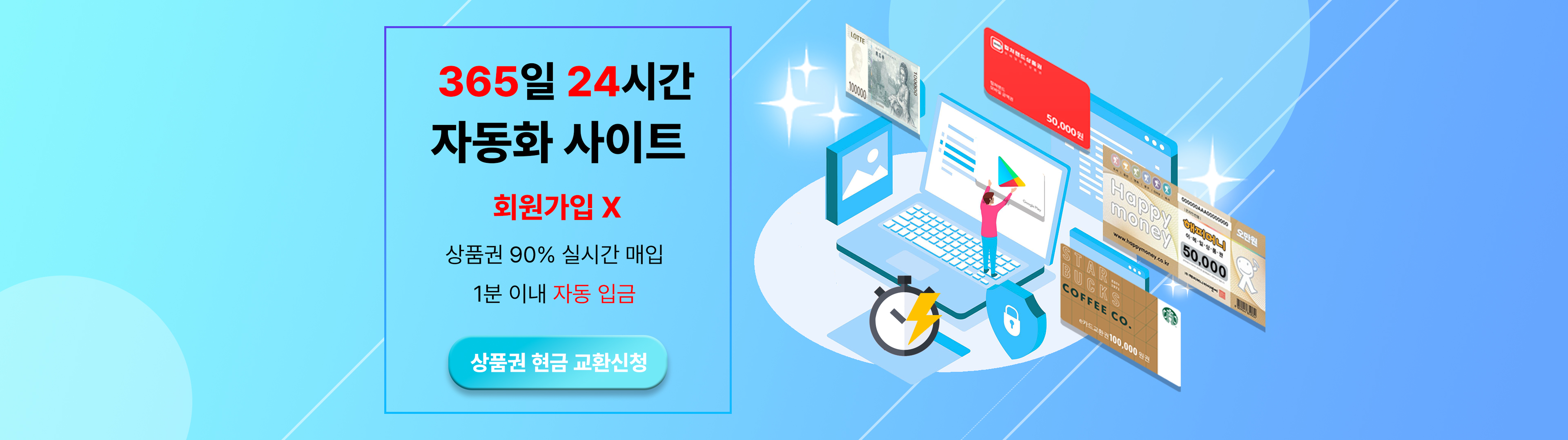 불필요하고 귀찮은 회원가입 없이, 간편한 교환방법으로 손쉽게 상품권 현금화를 하실 수 있습니다.